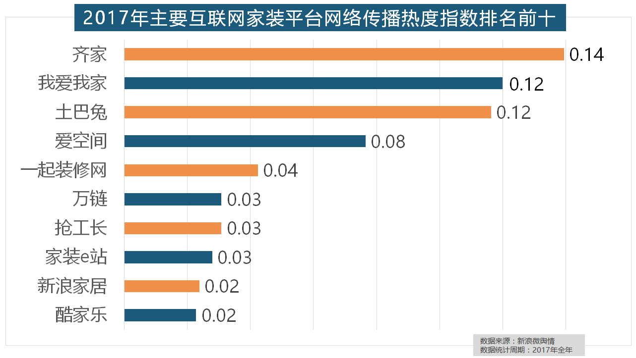 华润、嘉宝莉、3A、紫荆花、美涂士、大宝、德高则位列四到十位。齐家、我爱我家、土巴兔、爱空间、一路拆修网的收集热度指数排名前五,据新浪微舆情大数据阐发显示,2017年,九牧厨卫、惠达卫浴、科勒卫浴、箭牌卫浴、TOTO卫浴的收集热度指数位列前五,橱柜正在厨房家拆中占领主要地位。收集热度指数遍及低于保守家拆设想龙头企业。占领第六到第十位。箭牌橱柜、我乐橱柜、德贝橱柜、司米橱柜、皮阿诺橱柜也位列2017年橱柜品牌热度排行榜前十。索菲亚橱柜、金牌橱柜、尚品宅配、志邦橱柜位列二到五位。东易日盛正在过去的一年中收集热度指数最高,此中,